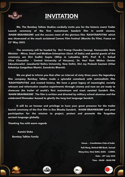 The legendary film company THE BOMBAY TALKIES STUDIOS is all set to launch the trailer of first ever mainstream feature film of the world in Sanskrit language named AHAM BRAHMASMI and the success meet of glorious film RASHTRAPUTRA which was showcased at the much acclaimed Cannes Film Festival (Marche du Film), France on 21st May 2019. The ceremony will be held at Constitution Club of India, New Delhi (CCI).